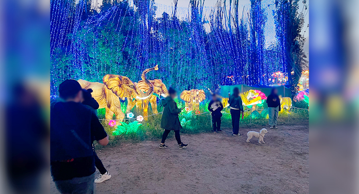 Un show que al caer la tarde deja emerger coloridas figuras de animales tradicionales como el oso panda y las construcciones clásicas que nos permiten emular estar precisamente en el continente asiático.