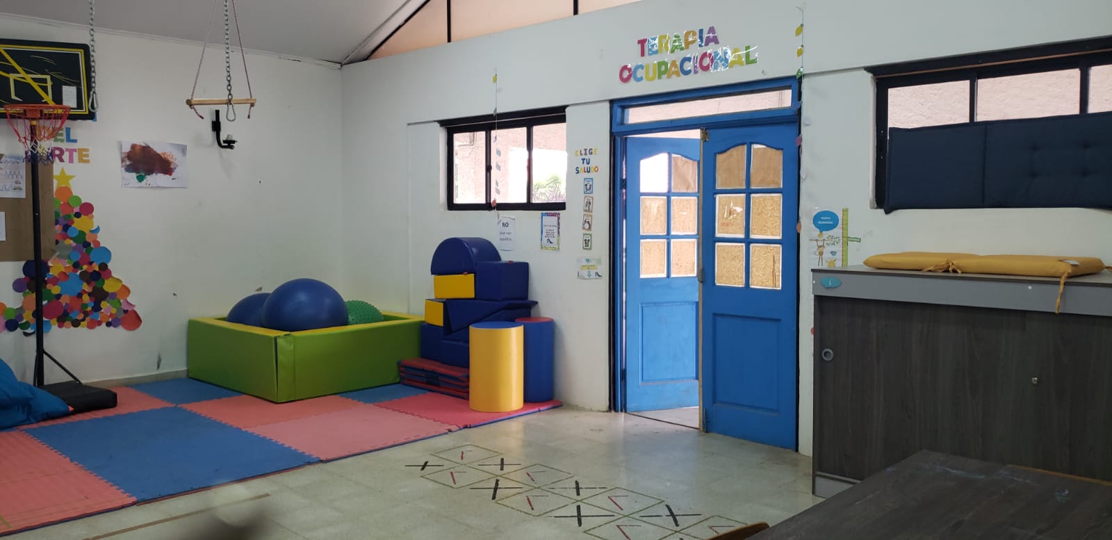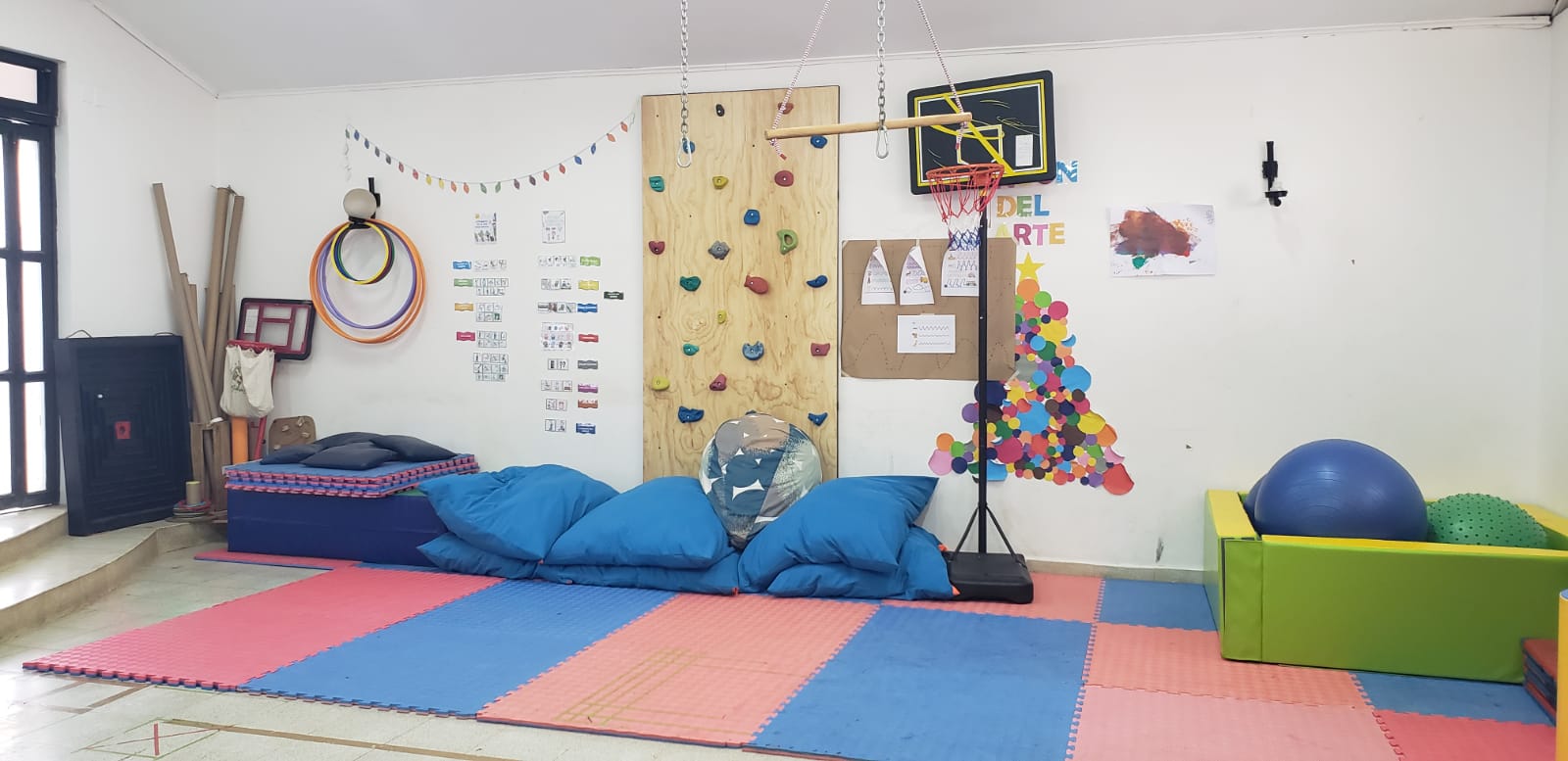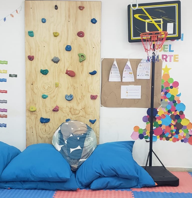 Los recursos con que cuenta, como piscina con pelotas, muro de escalada, chalecos con peso, cintas para colgarse, entre otros, hacen posible hacer un trabajo práctico de integración sensorial, motricidad fina y gruesa.